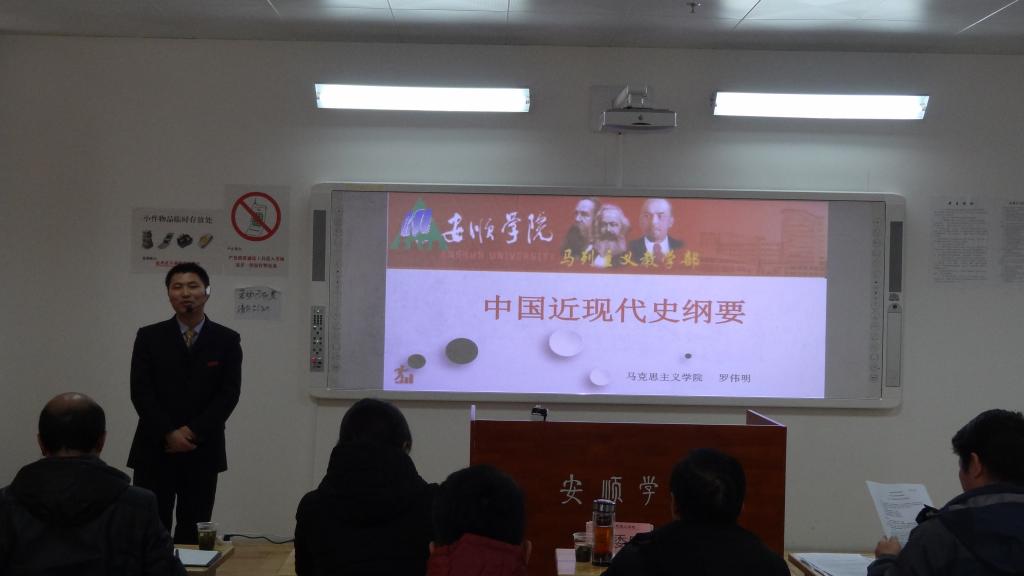 为进一步提升思政课教育教学质量,提高思政课专兼职教师队伍教学技能水平。由安顺学院思政课教学指导委员会主办,教务处和马克思主义学院承办的安顺学院2017年青年教师思政课教学技能系列竞赛活动之青年教师讲思政课教学技能竞赛于12月8日在特教楼多媒体教室举行。安顺学院副院长、思政课教学指导委员会常务副主任王芳恒教授,学工部部长殷红敏教授,马克思主义学院院长、思政课教学指导委员会办公室副主任黎进深教授,教务处副处长王家顺副教授出席竞赛并与三位在校学生共同担任竞赛评委,全体思政课教师观摩了竞赛。