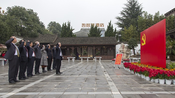 随后,在庄严的党旗下,罗荣彬书记带领校领导班子全体成员重温入党誓词。在罗荣彬书记领誓下,铿锵有力的宣誓声响彻故居,让现场所有人都深受感染,仿佛回到了那个风雨如磐的年代。