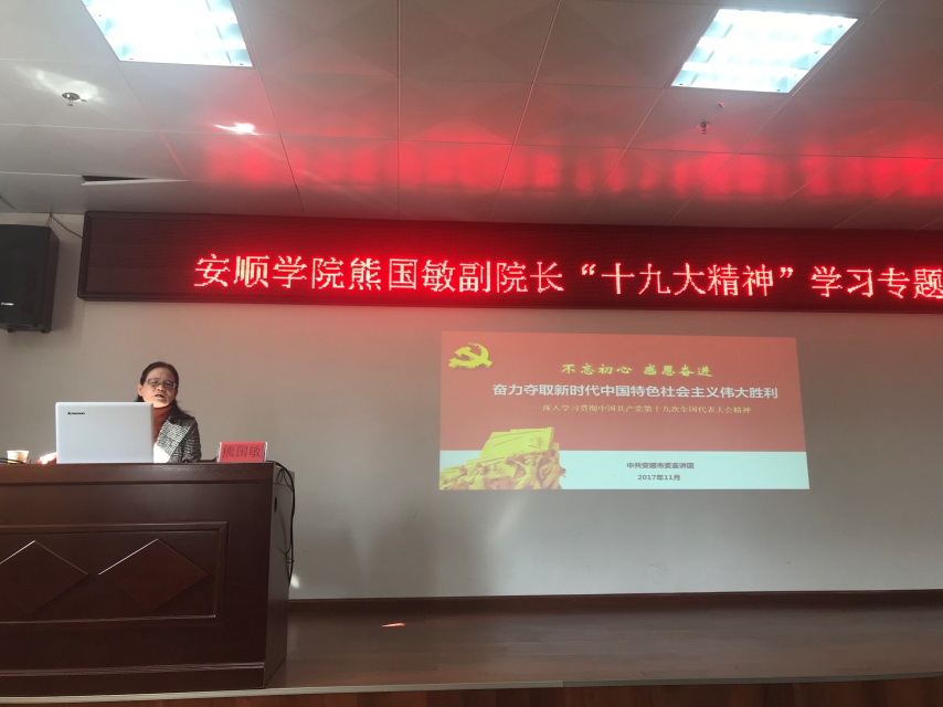 2017年11月27日下午,安顺学院副院长熊国敏在特教楼四楼会议室为学报编辑部、国资处、计财处、科研处、安顺试验区发展研究中心、特殊教育学院等部门教职工宣讲党的十九大精神。