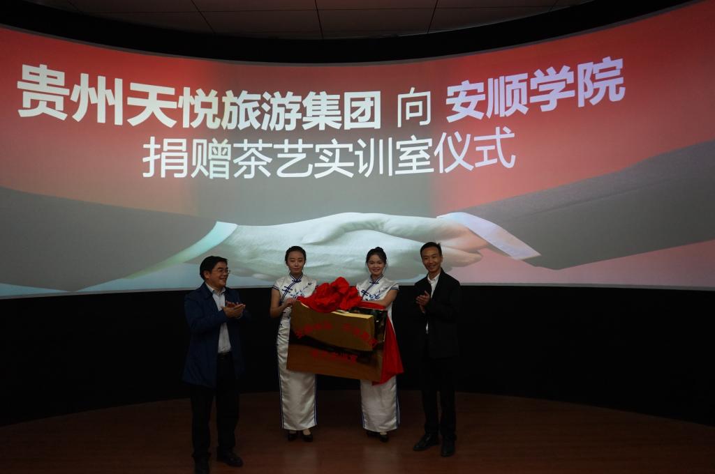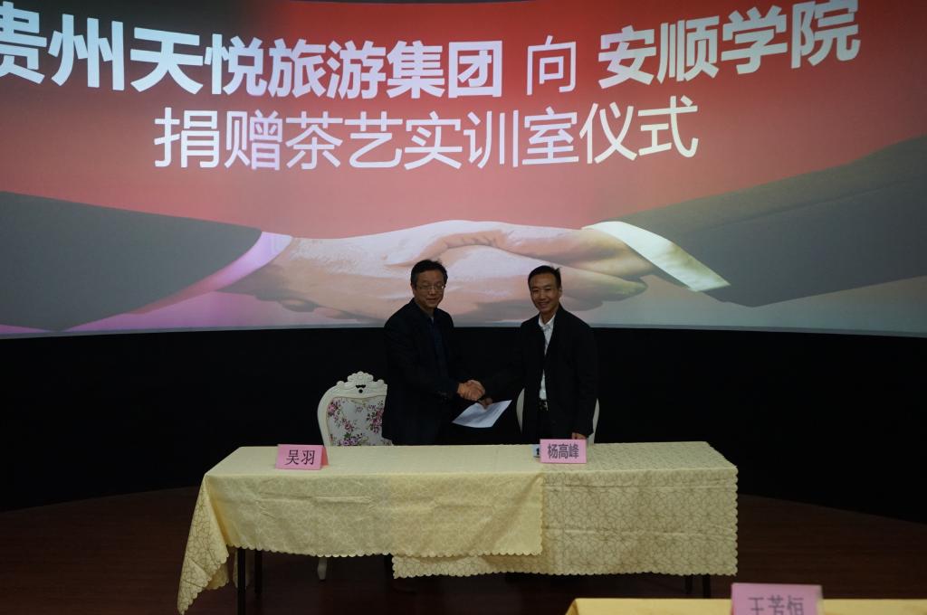 签约仪式上,杨高峰董事长向旅游学院茶艺实训室捐赠10万元建设基金。王芳恒副院长与杨高峰董事长共同为“安顺学院—天悦集团茶艺实训室”揭牌。吴羽院长与杨高峰董事长签订捐赠协议,蒋晓兰书记接捐赠建设投资金牌。