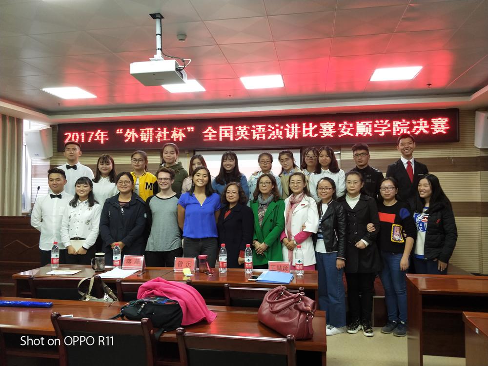2017年10月20日下午,由安顺学院外国语学院举办的2017“外研社杯”全国英语演讲比赛安顺学院赛区复赛在特教大楼举行。安顺学院副院长王芳恒,教务处处长支敏,外国语学院党总支书记虞均杰、院长蒋燕、副院长曾沉,对外交流合作处副处长王慧颖,以及外教Anna和Victor担任评委。参加本次演讲复赛的选手共13名,英语专业6名选手,非英语专业7名选手。