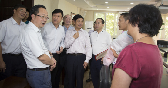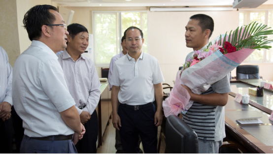 安顺市委书记曾永涛(左一)、市政协主席杨华昌(左二)、安顺学院党委书记罗荣彬(右二)看望慰问安顺学院教师蔡伟(右一)。