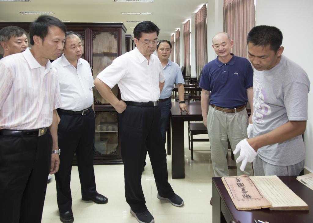 山东省政协副主席、党组成员许立全(中)一行听取安顺学院图书馆蔡伟博士介绍馆藏古籍。
