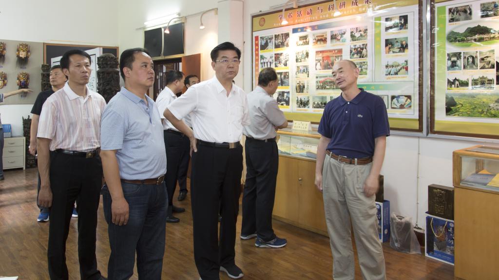 山东省政协副主席、党组成员许立全(右二)一行在安顺学院院长刘雷(右一)、安顺市政协副主席贺未泓(左二)等陪同下考察屯堡文化研究中心。