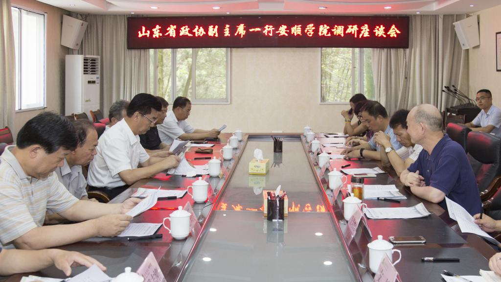 2017年7月25日,山东省政协副主席、党组成员许立全,省政协常委、提案委员会副主任王凯祥,省政协常委、港澳台侨和外事委员会副主任王瑞明,省政协常委、济南市政协副主席、济南重工股份有限公司董事长王伯芝,省政协常委、淄博市政协副主席郭利民,省政协委员、山东通发实业有限公司董事长张发军等一行,在贵州省政协港澳台侨与外事委员会专职副主任梁勇、安顺市政协副主席贺未泓、安顺市政协宣教文卫体委员会主任冯慧敏等陪同下到安顺学院调研指导工作。