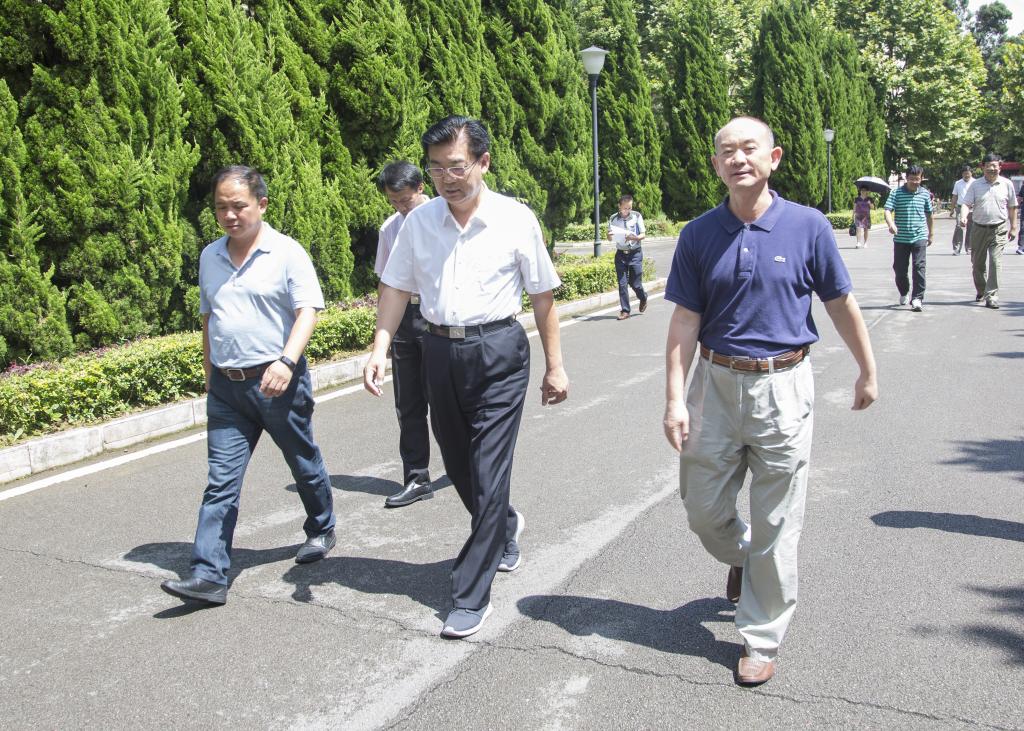 山东省政协副主席、党组成员许立全(中)一行在安顺学院院长刘雷(右)、安顺市政协副主席贺未泓(左)等陪同下考察安顺学院校园。