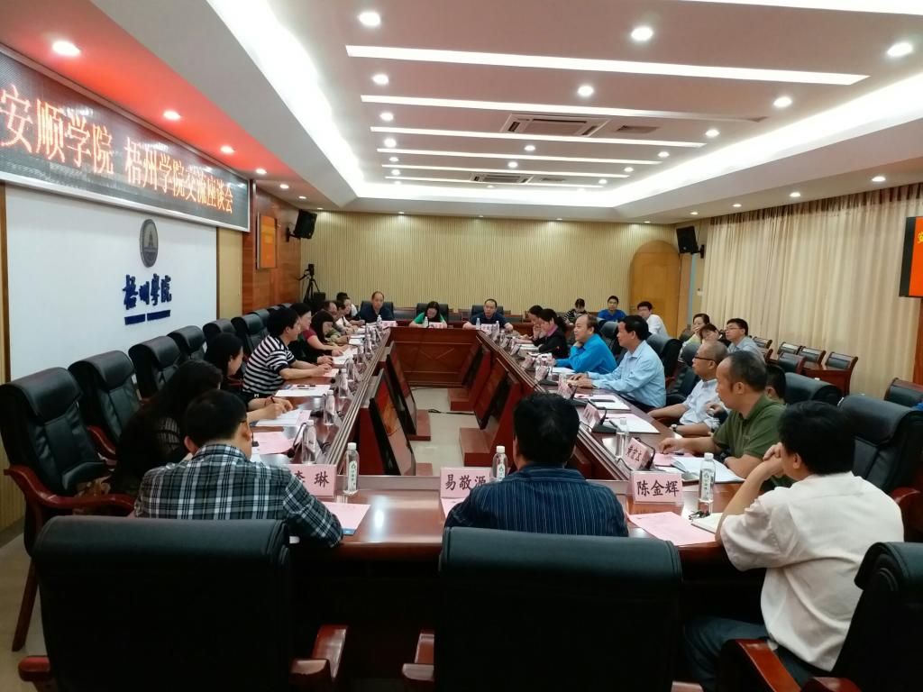 在梧州学院会议室,梧州学院副院长玉振明教授,党政办、宣传部、人事处、教务处、科研处、财务处、经管学院、机化学院、师范学院、信电学院、文法学院、职业学院、评建办等相关部门负责人与我校考察组一行进行了座谈交流。