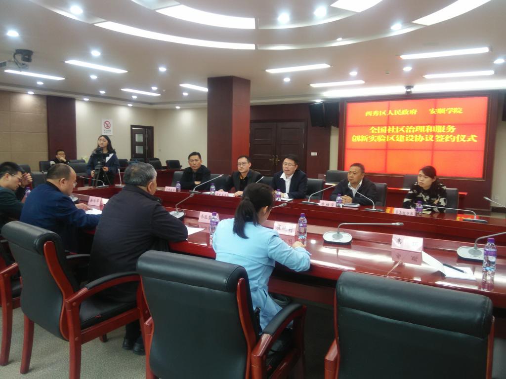 令狐荣涛副院长与武宗祥副区长签订了《安顺市西秀区人民政府安顺学院合作开展社区治理和服务创新实验区建设协议》;陈学军局长与徐忠院长签订了《安顺市西秀区民政局安顺学院政法学院社区治理和服务创新项目建设中期评估合作协议》。