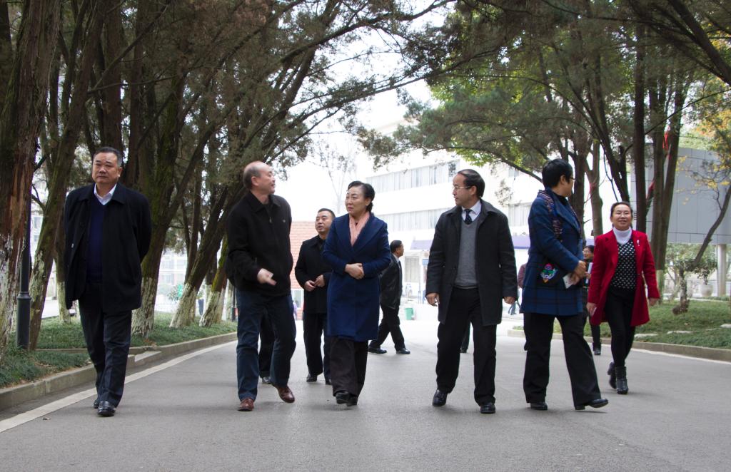 贵州省民族宗教事务委员会党组书记、主任向红琼(中)一行走访安顺学院校园