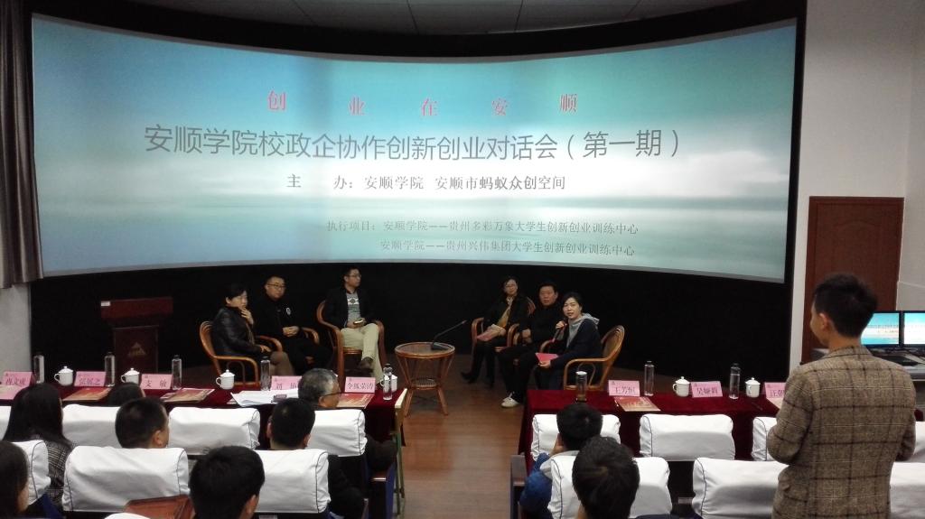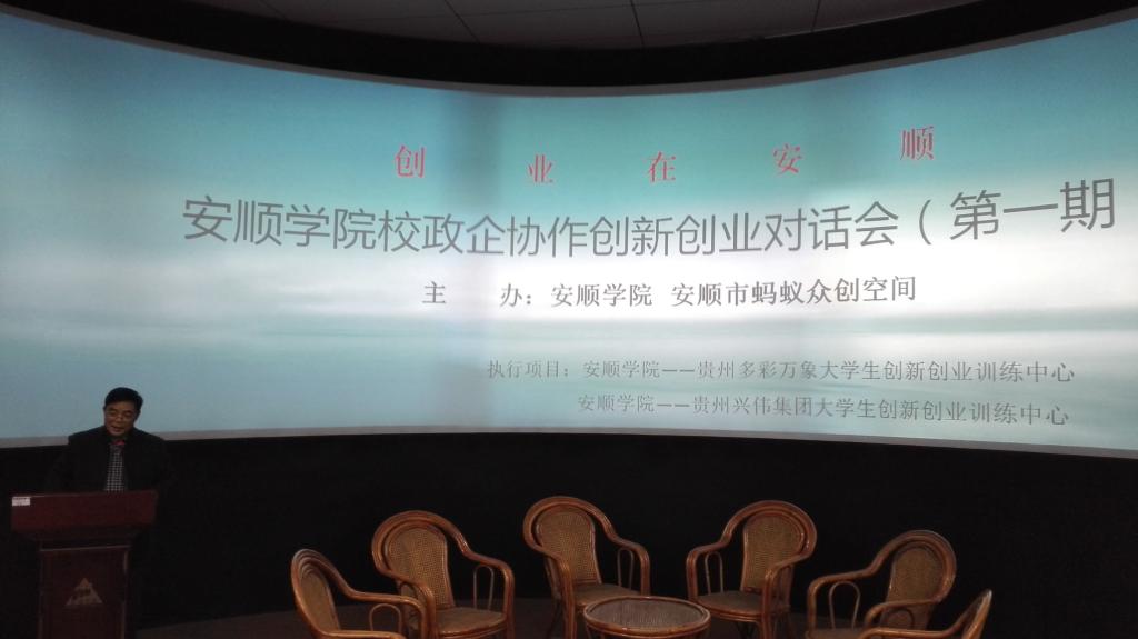 2016年11月7日下午,由安顺学院和安顺市蚂蚁众创空间联合主办的“安顺学院校政企协作创新创业对话会”在旅游学院实训室举行。安顺学院副院长王芳恒、令狐荣涛,安顺市人力资源局副局长吴娅莉,安顺市西秀区科技局局长刘艳,贵州朵贝重华茶业公司董事长、市管专家、全国创业之星汪朝祥,贵州优加创品信息科技公司总经理冉文虎,安顺万邦置业有限公司副总经理张展之,安顺学院党委委员、教务处处长支敏,安顺学院实验管理中心兼教务处副处长杨筱珊以及安顺学院创新创业师生代表参加了对话会。本期对话会由安顺学院——贵州多彩万象大学生创新创业训练中心和安顺学院——贵州兴伟集团大学生创新创业训练中心两个项目执行承办。