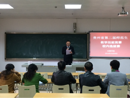 2016年10月9日,贵州省第二届师范生教学技能竞赛校内选拔赛在安顺学院特教楼5楼录播室举行。安顺学院副院长王芳恒观摩了此次选拔赛。教务处处长支敏、实验管理中心主任兼教务处副处长杨筱珊、人文学院院长雷鸣、数理学院书记庄中文、数理学院院长王大伦、外国语学院院长蒋燕、化工学院院长李琳、农学院副院长施渺筱和电信学院教师田建勇9位评审专家对参赛选手进行了客观、公正的评价。来自人文学院、数理学院、外国语学院、化工学院及农学院的17名选手参加了语文、数学、英语、物理、化学和生物6个学科的选拔。