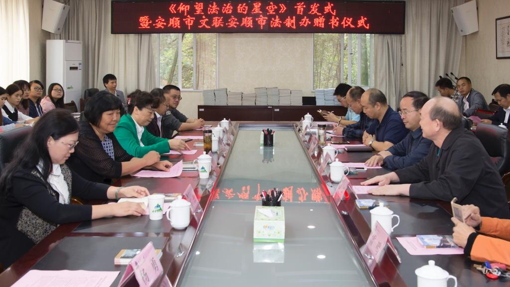 9月21日上午,安顺学院与安顺市文联、安顺市法制办在学校行政楼会议室举行《仰望法治的星空》图书首发式暨赠书仪式。安顺学院党委书记罗荣彬、院长刘雷、副院长郭本华,安顺市文联主席姚晓英、市人民政府法制办公室原主任唐薇、市文联副主席郭堂贵、市文联党组成员秘书长王玮、市人民政府法制办公室副主任袁蕾、安顺学院人文学院、政法学院、图书馆负责人及政法学院法学教师和学生代表参加了赠书仪式。仪式由郭本华副院长主持。