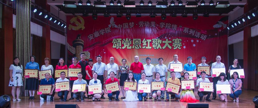 6月27日下午,由中共安顺学院委员会主办,安顺学院工会委员会及党委组织部承办的“中国梦·劳动美·学院情”系列活动之颂党恩红歌大赛在大礼堂隆重举行。安顺学院刘雷,党委副书记陶文彩,副院长熊国敏、郭本华,以及各学院、部门负责人出席比赛。由全校各分工会组成的22支教职工代表队参加比赛,安顺学院副院长王芳恒,艺术学院熊黏教授、杨双红副教授、教师王钧及梁勇担任比赛评委。