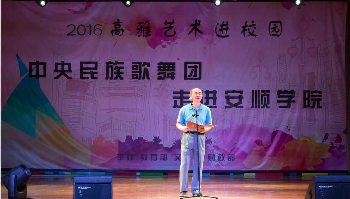 6月14日晚,由教育部、文化部、财政部联合主办,安顺学院承办的“2016年高雅艺术进校园——中央民族歌舞团走进安顺学院”活动在安顺学院礼堂隆重上演。学校党委书记罗荣彬,院长刘雷,党委副书记陶文彩,副院长令狐荣涛,党委委员、教务处长支敏和700余名师生观看了演出。