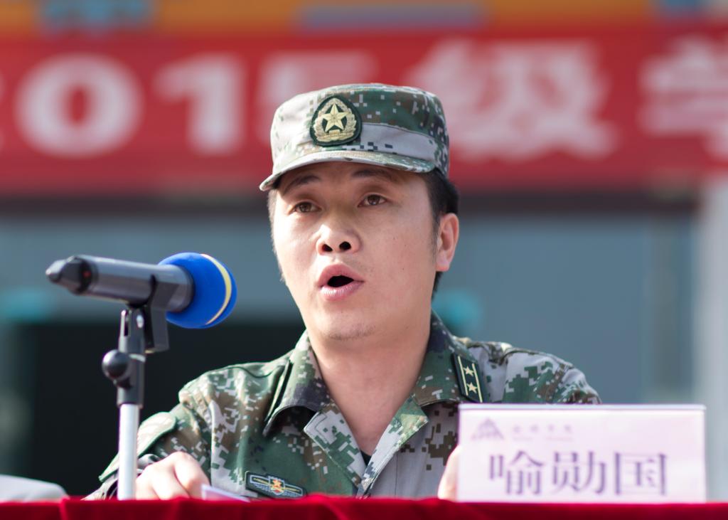 中国人民解放军贵州陆军预备役师第三团一营营长、军训团参谋长喻勋国作军训要求讲话,预祝同学们在军训取得优异的成绩,强调一切行动听从指挥、服从教官的正当要求。