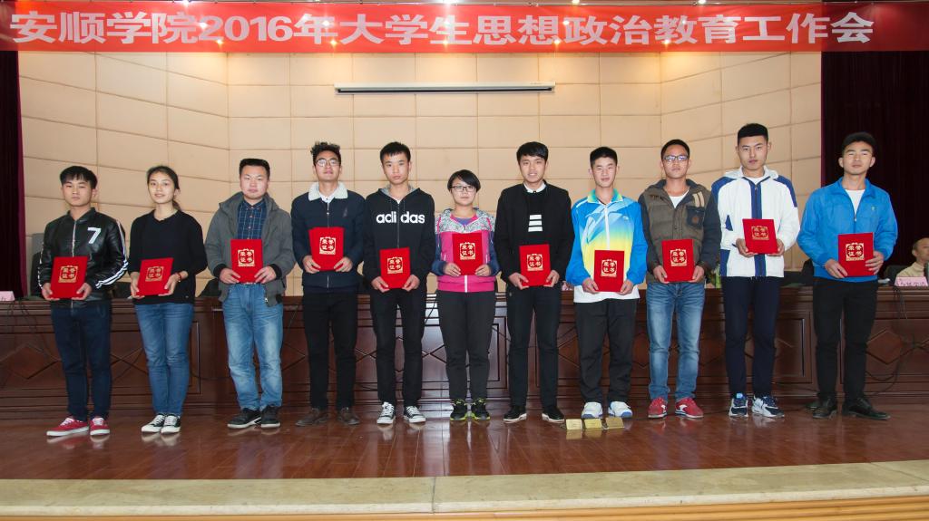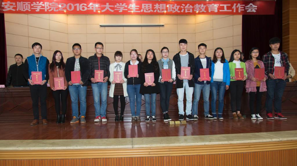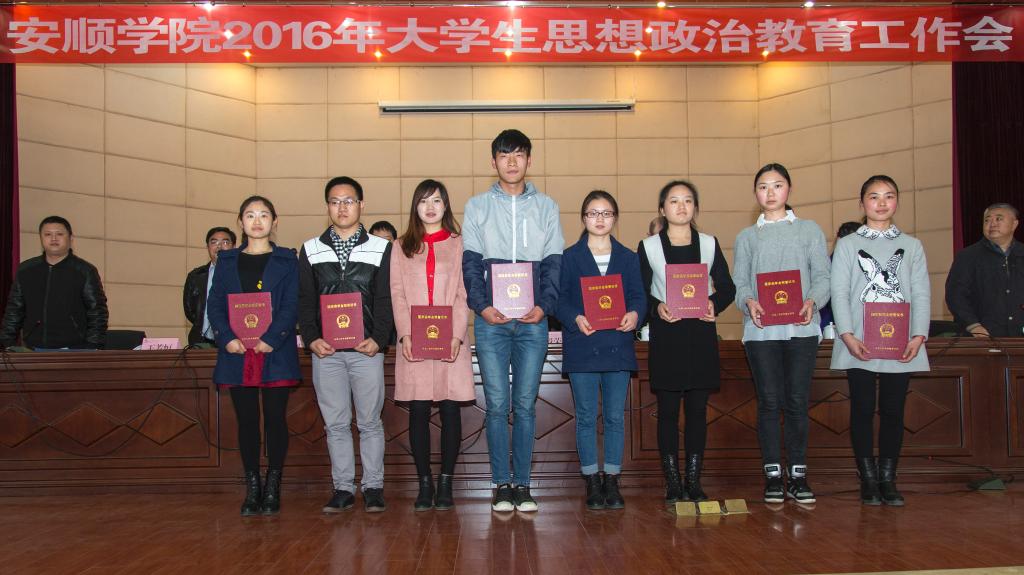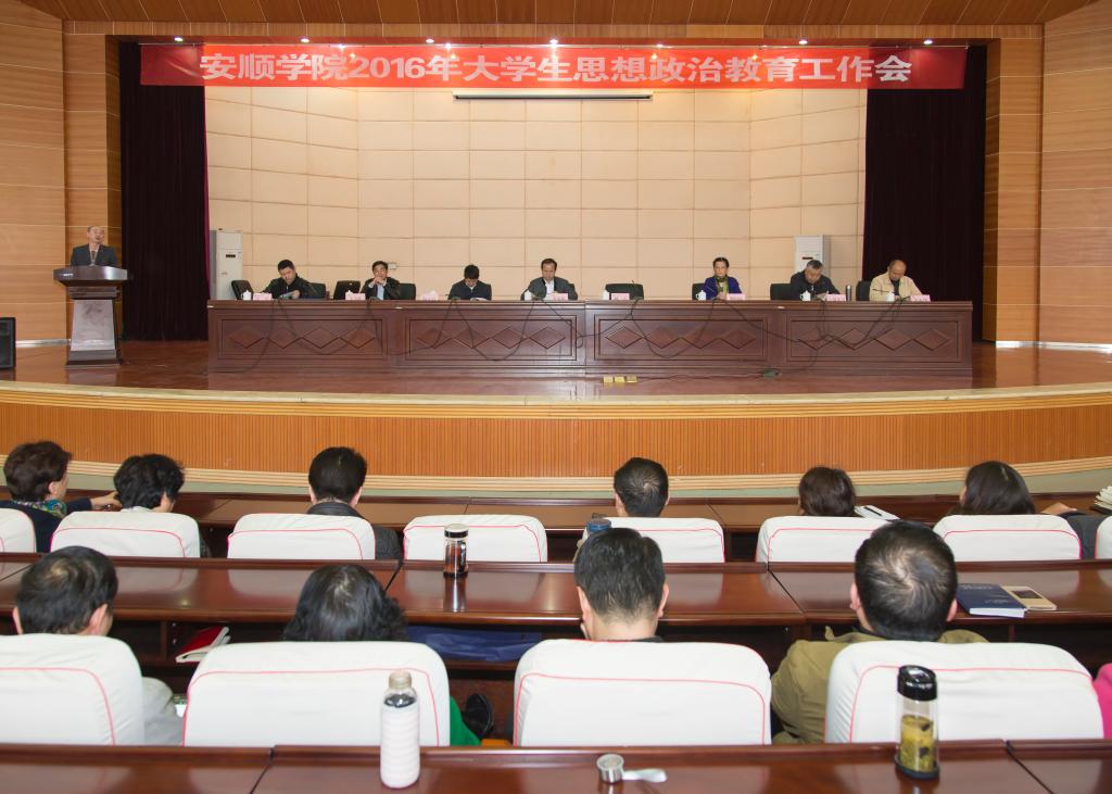 2016年3月21日下午,安顺学院2016年大学生思想政治教育工作会在学校学术报告厅隆重召开。安顺学院党委书记罗荣彬,党委副书记、院长刘雷,党委副书记陶文彩,党委委员、副院长熊国敏,党委委员、副院长王芳恒,党委委员、副院长令狐荣涛,党委委员、纪委书记马力,党委委员、副院长郭本华,党委各工作部门班子成员,大学生思想政治教育工作领导小组、学生工作领导小组各成员部门班子成员,各二级学院党政主要负责人,学工部(学生处、武装部)、招就处、学生资助管理中心、团委全体人员,马克思主义学院(马列主义教学部)班子成员和专任教师,一线专职辅导员、优秀班主任、先进学生集体和优秀学生个人代表,校级学生组织干部和团体代表,各学院团总支、学生会学生干部和其他同学代表参加会议。会议由令狐荣涛副院长主持。