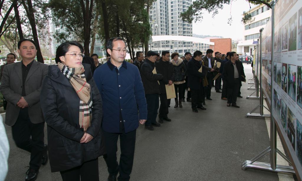 与会人员观看展现安顺学院大学生思想政治教育和校园文化建设工作的展板