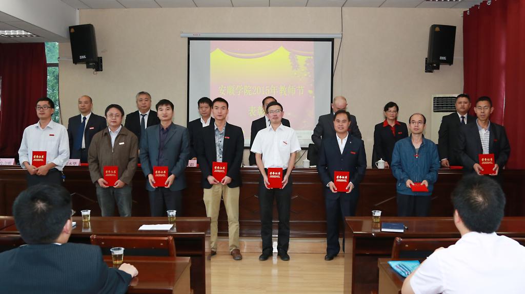 金菊溢彩,硕果飘香。为庆祝第三十一个教师节,表彰先进、树立典型,充分发挥示范带动作用,进一步激励广大教师和教育工作者献身教育事业,建设一支高素质教师队伍和教育管理干部队伍,推进我校教育事业的改革与发展,提振广大教职员工精气神,更进一步做好迎评促建工作。9月11日上午,安顺学院在水管所会议室隆重举行教师节表彰大会。学校党委书记罗荣彬,院长刘雷,党委副书记陶文彩,副院长熊国敏、令狐荣涛,纪委书记马力,副院长郭本华,受表彰先进人员,各二级学院党总支书记、院长,党政办公室、纪委、组织部、宣传部、人事处、教师工作处、学生处、教务处、科研处、计财处等部门负责人以及部分学生代表齐聚一堂,共同庆祝第31个教师节。会议由刘雷院长主持。