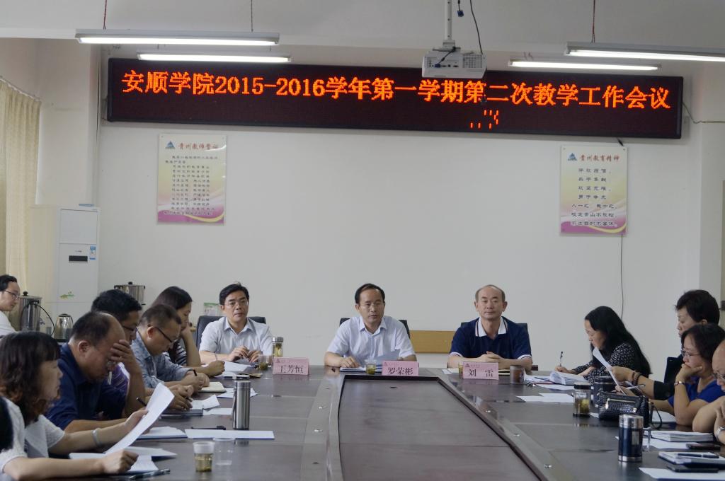 9月2日下午,安顺学院在教务处会议室召开了2015-2016学年第一学期第二次教学工作例会。党委书记罗荣彬、院长刘雷、副院长王芳恒、各学院(教学部、中心)院长(主任)、各学院党总支书记、各学院(教学部、中心)分管教学副院长(副主任)、教务处科级以上干部参加了会议。会议由支敏处长主持。