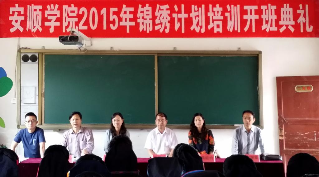 2015年8月4日上午,为推进民族民间特色手工业与妇女就业同步发展,促进创业带动就业,引导农村妇女增收致富,“安顺学院2015年锦绣培训班”在黄果树风景区大洋小学举行开班仪式。安顺学院党委书记罗荣彬、安顺市妇联副主席卓颖,安顺学院艺术学院党总支书记蒋晓昀、院长罗文帝等出席了开班仪式。开班仪式由罗文帝主持。参加培训的农村妇女学员40人。