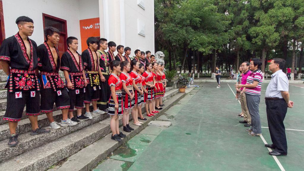7月3日,安顺市人民政府副市长罗晓红、安顺学院党委书记罗荣彬、安顺市民委主任罗茂松等一行到学校训练场地看望安顺学院备战全国第十届少数民族体育运动会表演项目(仡佬族斗鸡舞)的运动员。