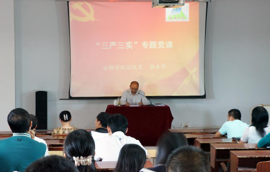6月12日上午,安顺学院党委委员、副院长郭本华在学校电教楼多媒体教室为公共计算机教学部、国资处、基建处、后勤处、保卫处、图书馆、计算机与网络管理中心、博物馆、档案馆及电信学院等部门全体党员上“三严三实”专题党课。