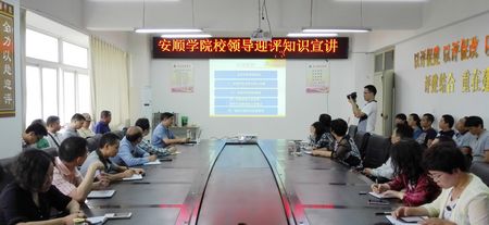 2015年6月11日下午,安顺学院副院长王芳恒在教务处四楼会议室为党政办、发展规划处、教务处、对外交流与合作处、图书馆、计算机与网络管理中心、公共计算机教学部、博物馆、档案馆、评建办等部门全体人员作本科教学工作合格评估动员宣讲。