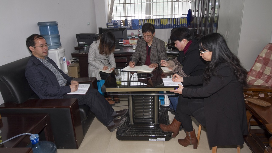 安顺学院党委书记罗荣彬(左一)听取特教学院书记邬贤芳(右二)、特教学院院长李镇译(中)、特教学院副院长王玉(右一)作工作汇报
