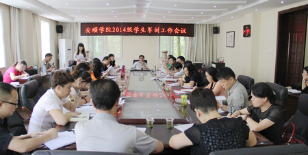 9月2日下午,安顺学院2014级学生军训工作会议在行政楼二楼会议室召开,出席会议的有安顺学院副校长王芳恒、党政办主任韦英、宣传部部长蔡少平、学工部(武装部)部长殷红敏、教务处处长支敏、团委书记邬贤芳、后勤处处长崔振国、学生资助管理中心主任包剑惠、保卫处副处长汤锡勇、各校属学院党总支书记及部分军训团成员。会议由殷红敏部长主持。