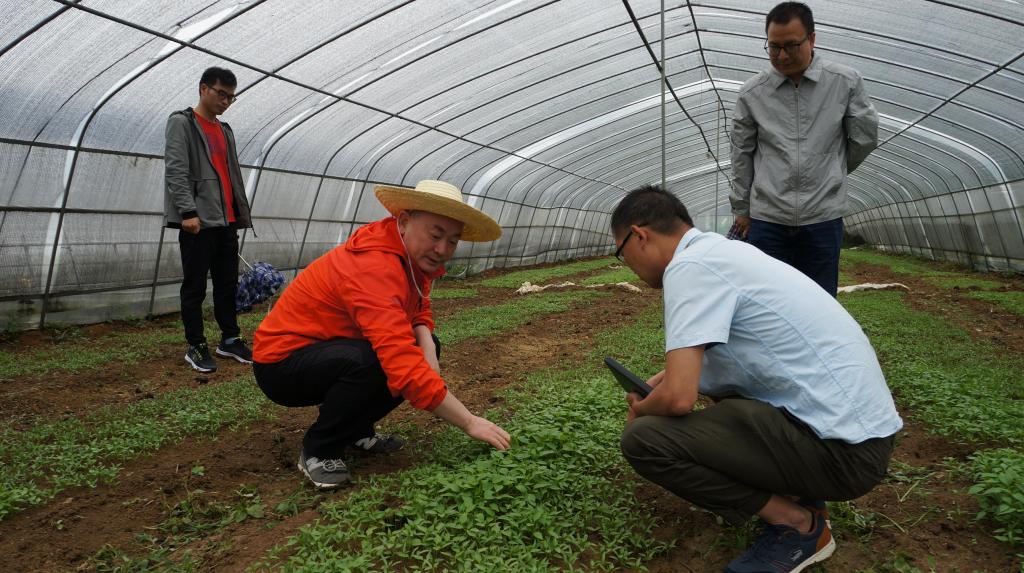 安顺学院院长刘雷(左二)在五指山村辣椒育苗大棚实地查看