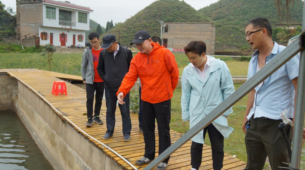 安顺学院院长刘雷(右三)实地查看五指山村鱼塘