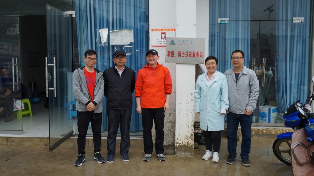 安顺学院院长刘雷(左三)一行在五指山村安顺学院教授、博士扶贫工作站牌匾前合影