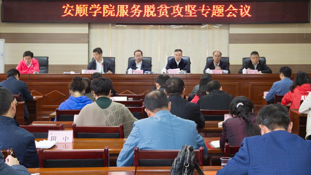 2018年9月28日上午,安顺学院服务脱贫攻坚专题会议在学校特教大楼7楼会议室举行。党委书记罗荣彬、校长吴次南、党委副书记陶文彩、副校长顾名宇、纪委书记马力及全校各部、处、室主要负责人和各二级学院党总支书记(副书记)、院长参加了会议。陶文彩副书记主持会议。