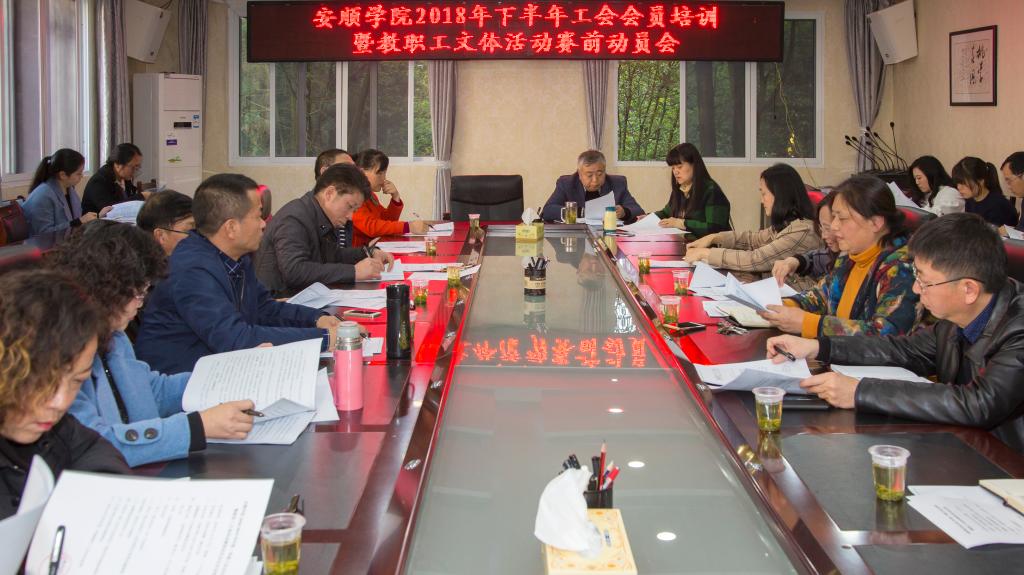 12月4日下午,安顺学院2018年下半年工会会员培训暨教职工文体活动赛前动员会在行政楼二楼会议室召开,安顺学院党委委员、副校长令狐荣涛,各二级学院书记、各分工会主席和工会全体成员出席本次会议。会议由令狐荣涛副校长主持。
