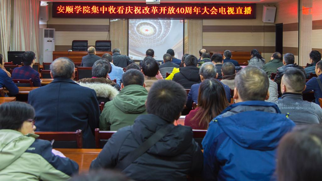 2018年是改革开放四十周年,四十年众志成城、四十年砥砺奋进、四十年春风化雨。全国各族人民在中国共产党的坚强领导下,苦干实干、开拓进取、创新创造,谱写了一曲改革开放的壮丽乐章。2018年12月18日上午10时,举国欢庆、备受关注的全国庆祝改革开放四十周年大会在北京召开。为庆祝改革开放四十周年,深入学习宣传贯彻习近平新时代中国特色社会主义思想,安顺学院认真组织师生员工通过各种形式收听收看大会现场直播。