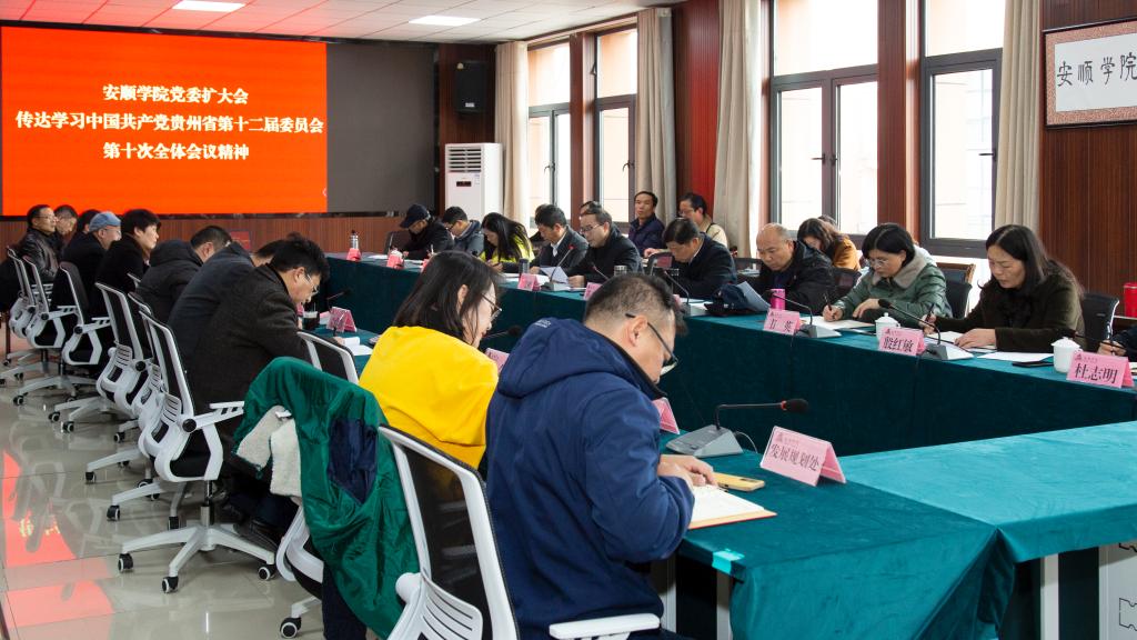 2021年12月3日,安顺学院召开党委扩大会传达学习中国共产党贵州省第十二届委员会第十次全体会议精神,校领导班子成员及各职能部门主要负责人,各二级学院党委书记、院长参加学习。党委书记罗荣彬主持会议并提出要求。